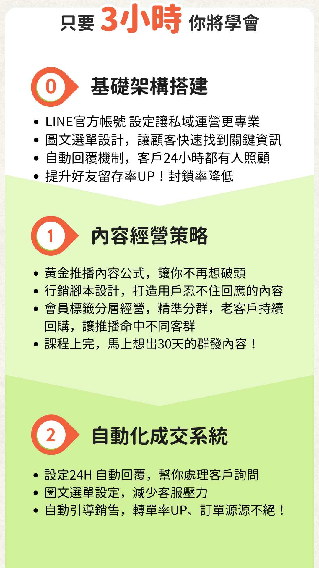 帶你掌握LINE官方帳號的關鍵方法,從帳號建置、圖文選單設計、自動回覆訊息、會員內容推播,建立屬於自己的客戶通道。透過實作演練,你將學會如何從每個地方導流到LINE官方帳號,將詢問的客人轉換成持續有互動的鐵粉,打造專屬的導流+回流系統。