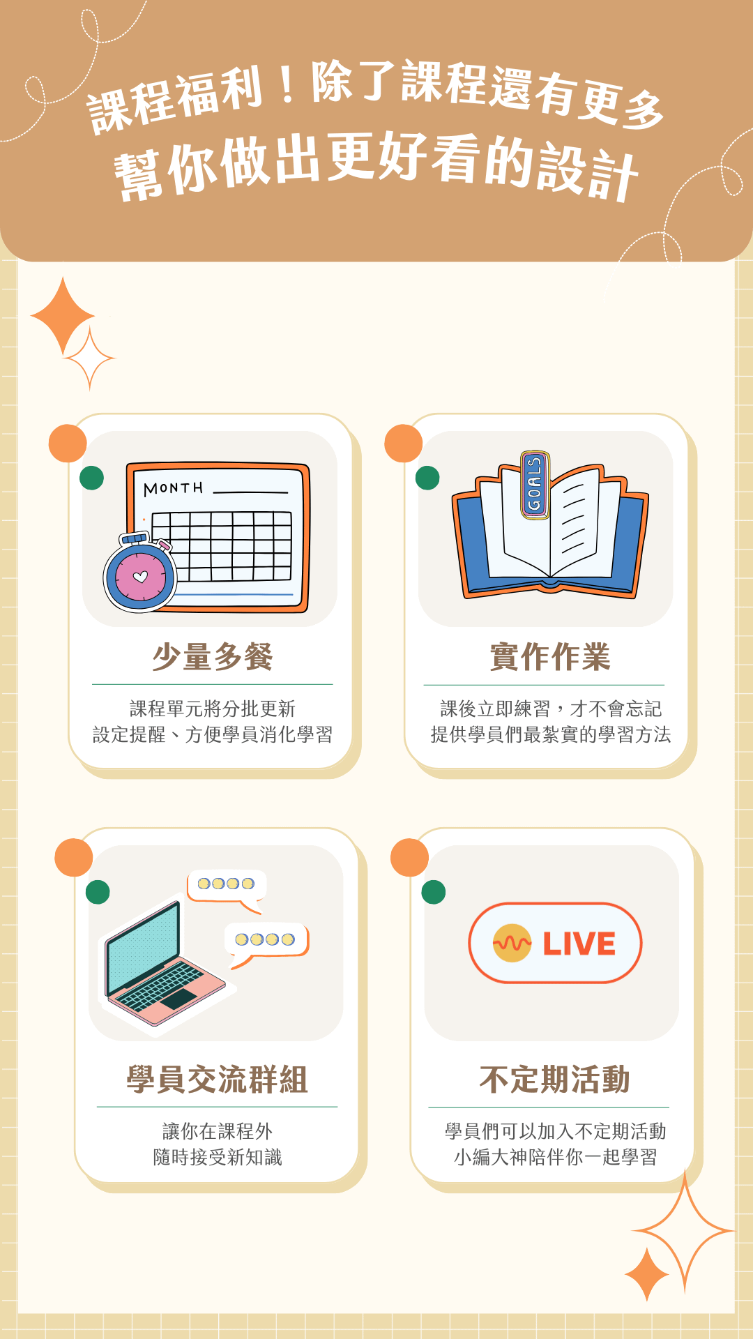 - 你不只購買了一門課程,更是加入共享社群。我們鼓勵學員之間的互助和交流,在這個終生學員交流群中,你可以隨時分享你的設計,獲得反饋和靈感。不僅可以提升自己的設計技能,還可以擴大你的設計社交圈,認識更多志同道合的朋友。
