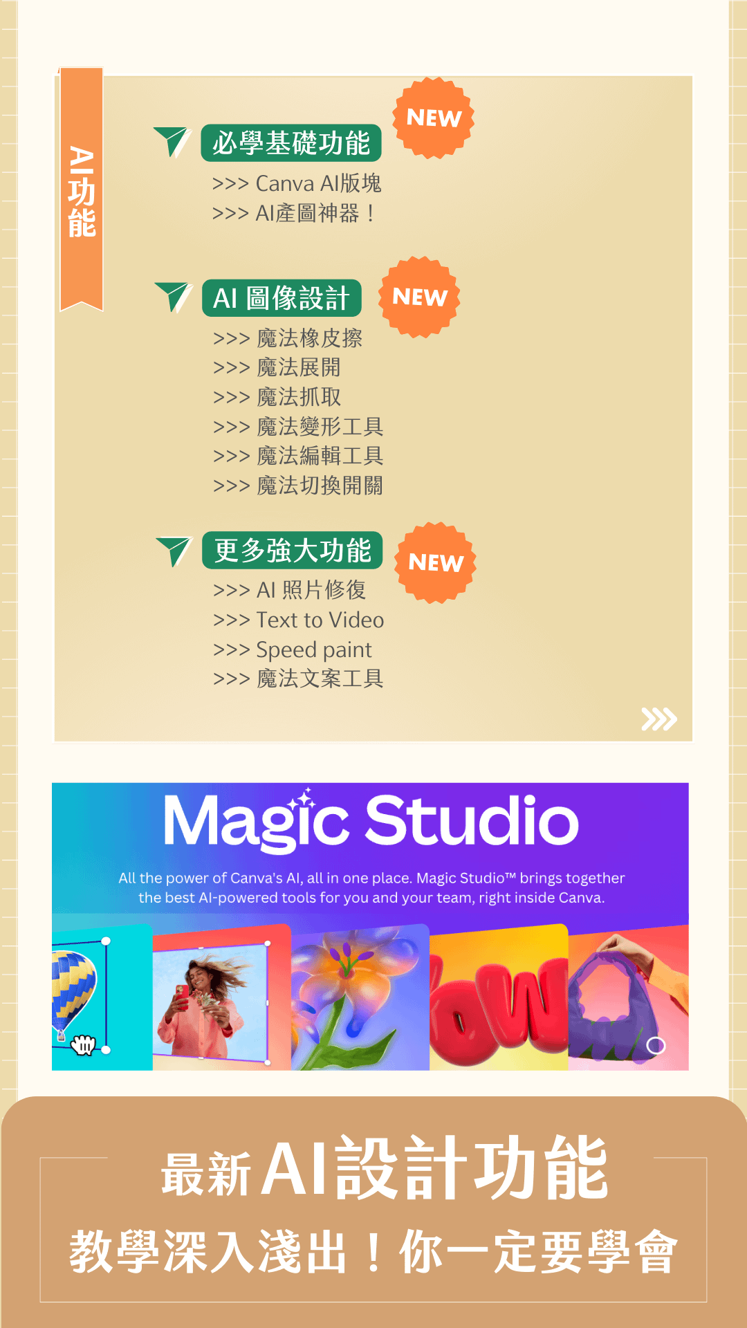 - AI工具應用:Canva的AI工具可以大大提高你的設計效率和創意。我們會教你如何使用這些工具,讓設計變得更加智能和有趣。