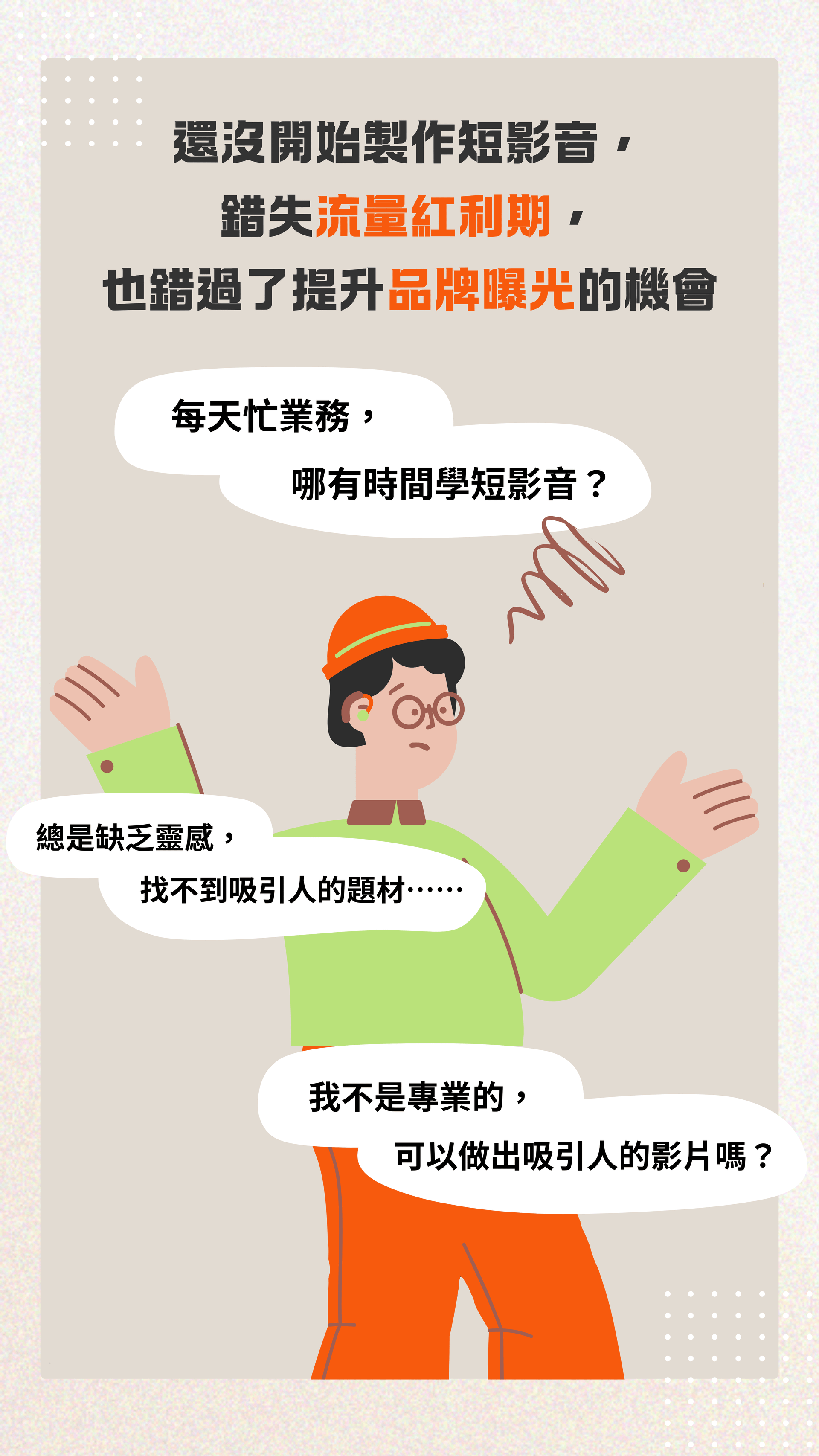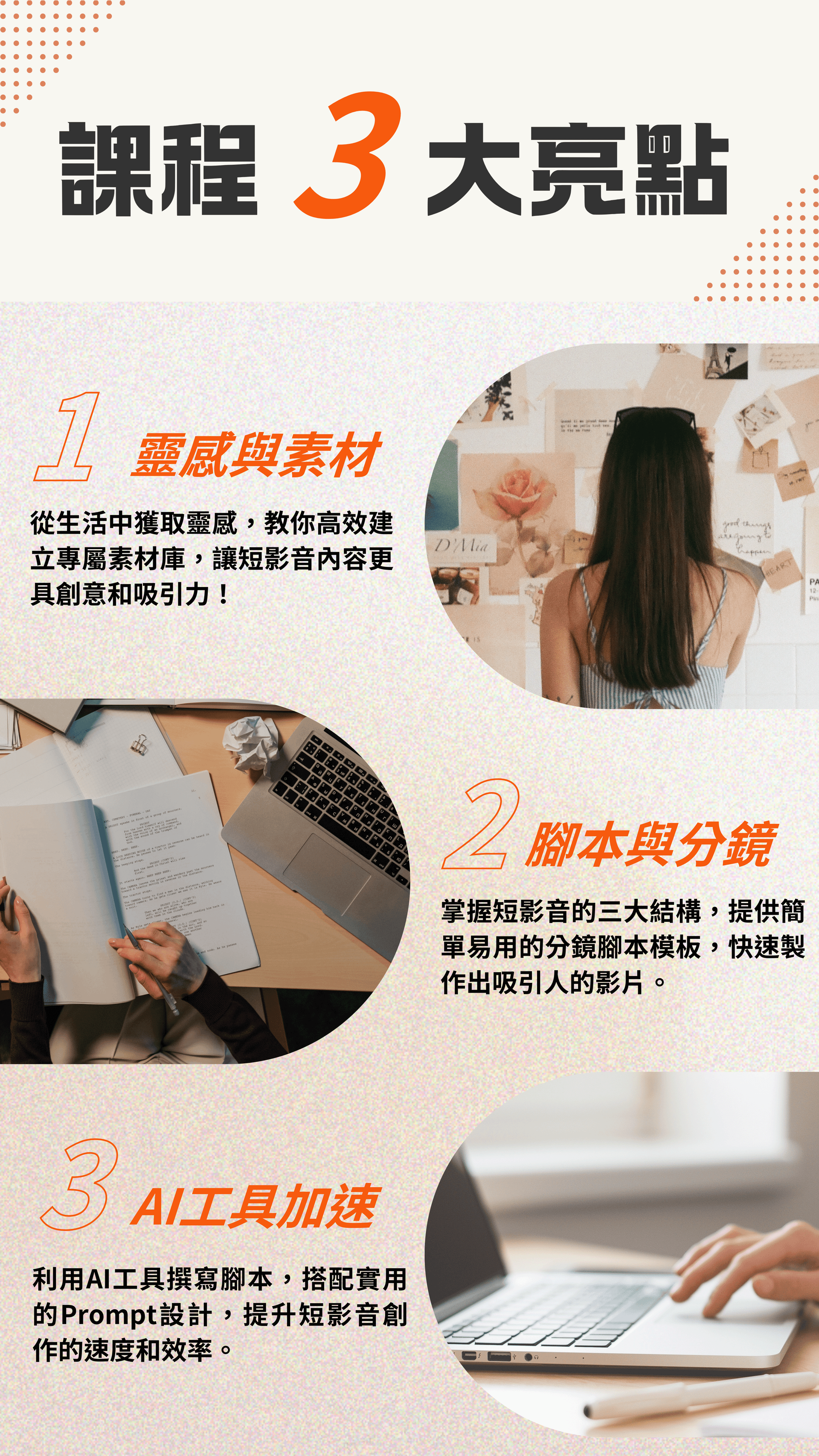 這門課程短影音課程系列第二堂,專為短影音初學者設計,教你從靈感搜集到內容企劃,結合AI工具與腳本模板,高效製作短影音,輕鬆推廣品牌,吸引更多潛在客戶。