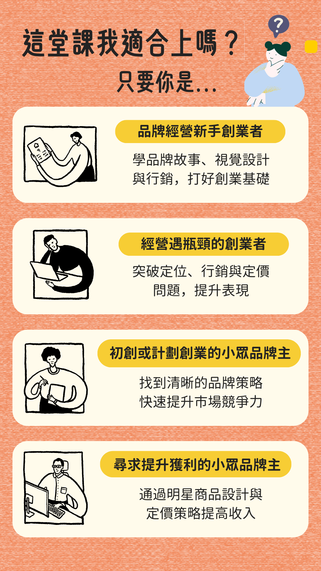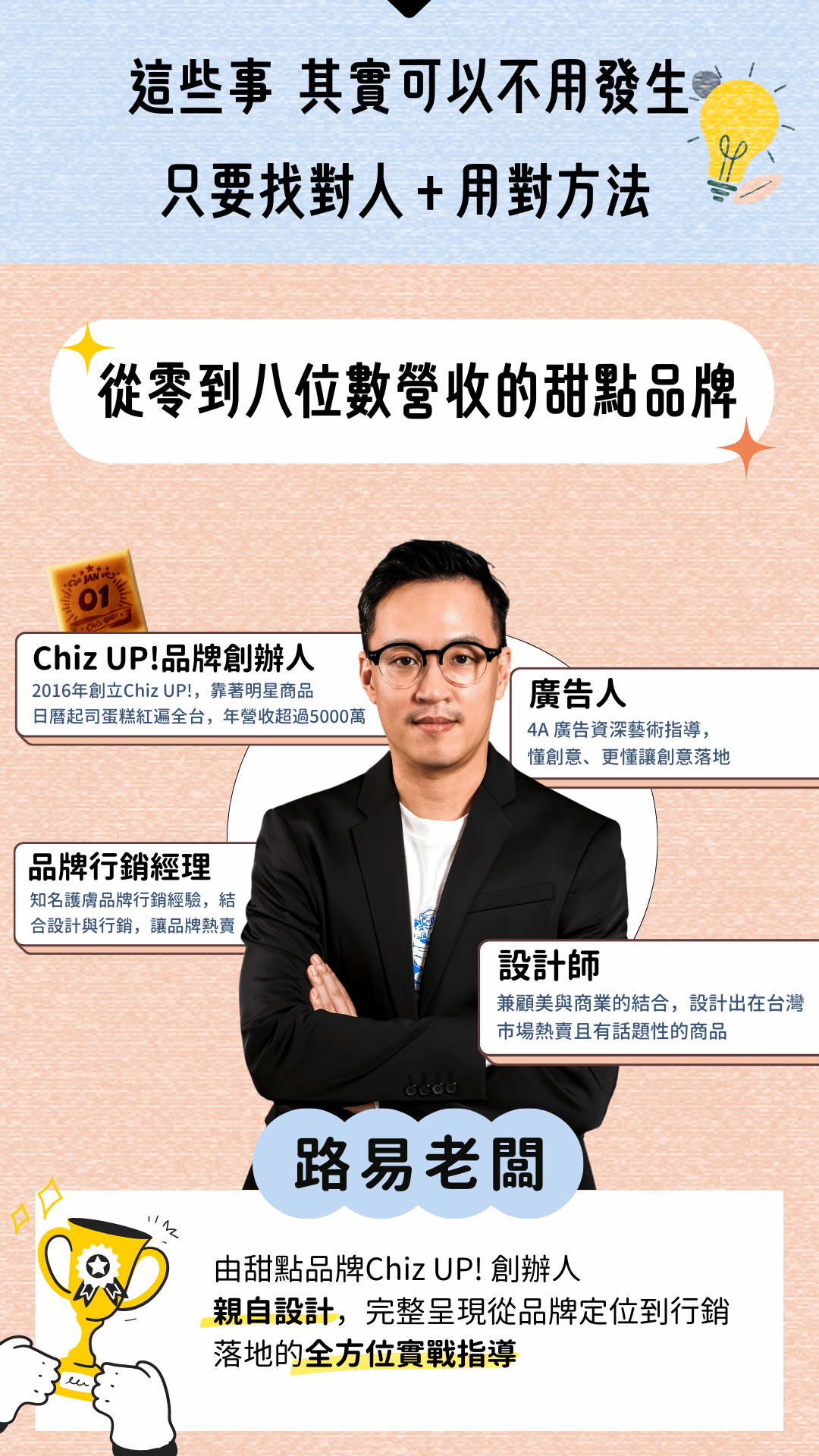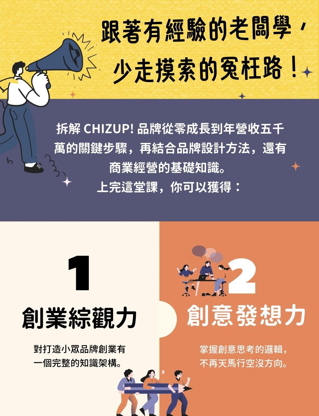 ChizUP!創辦人路易老闆親授「小眾創業全攻略」,從品牌定位、目標市場分析到品牌故事塑造,涵蓋視覺設計、社群經營等實用技巧,幫助你在市場中建立獨特競爭力,打造有鐵粉的高價值品牌!