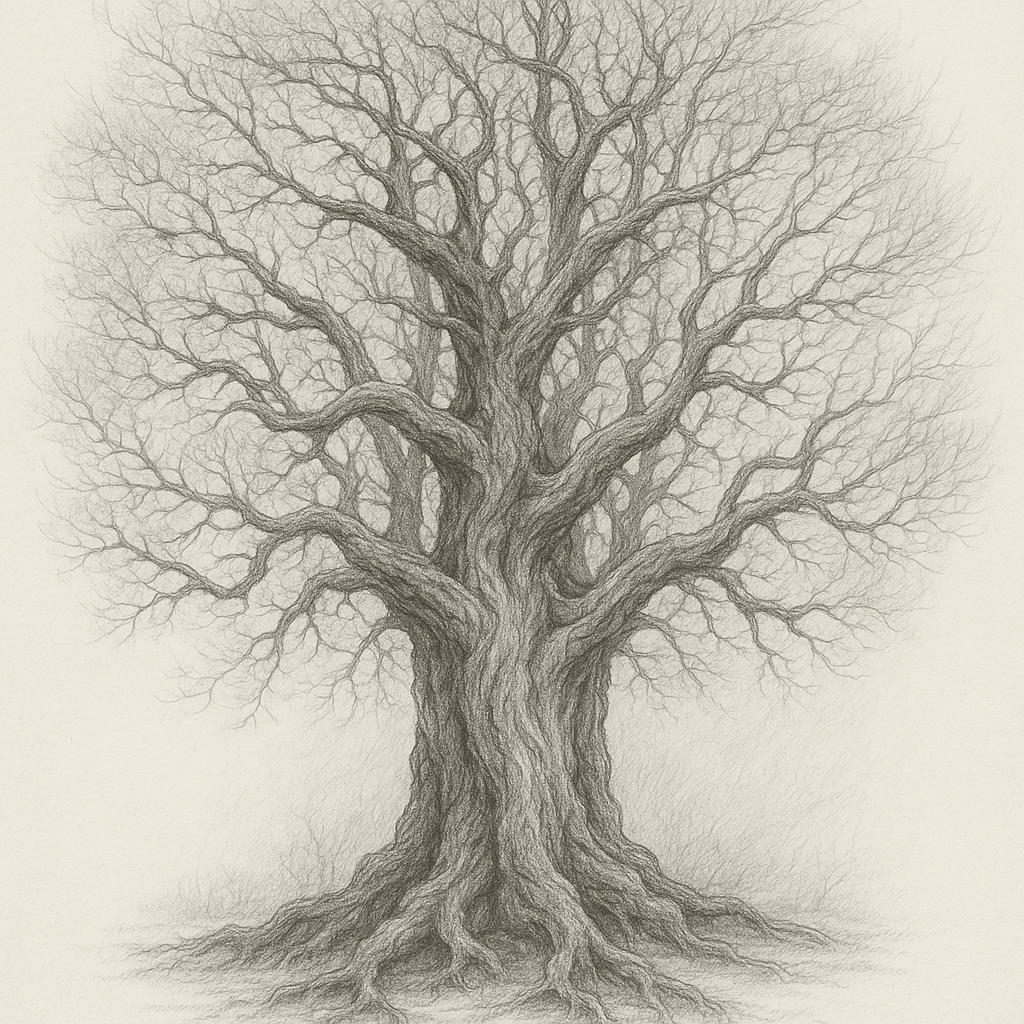 ``` A detailed pencil sketch of an old tree, fine lines, shading with graphite, realistic drawing, black and white, artistic sketching technique ```