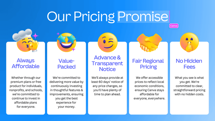 Canva 這次特別強調,這次新的定價原則, 源自於Canva 創立十年來的核心信念:設計應該是可及的、公平的、有價值的,並且是愉快的體驗。